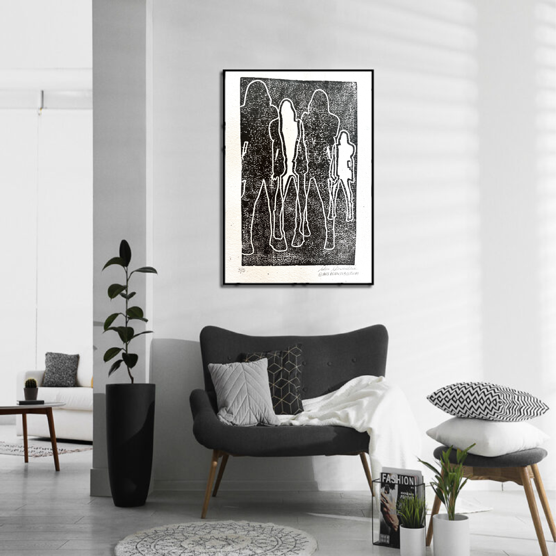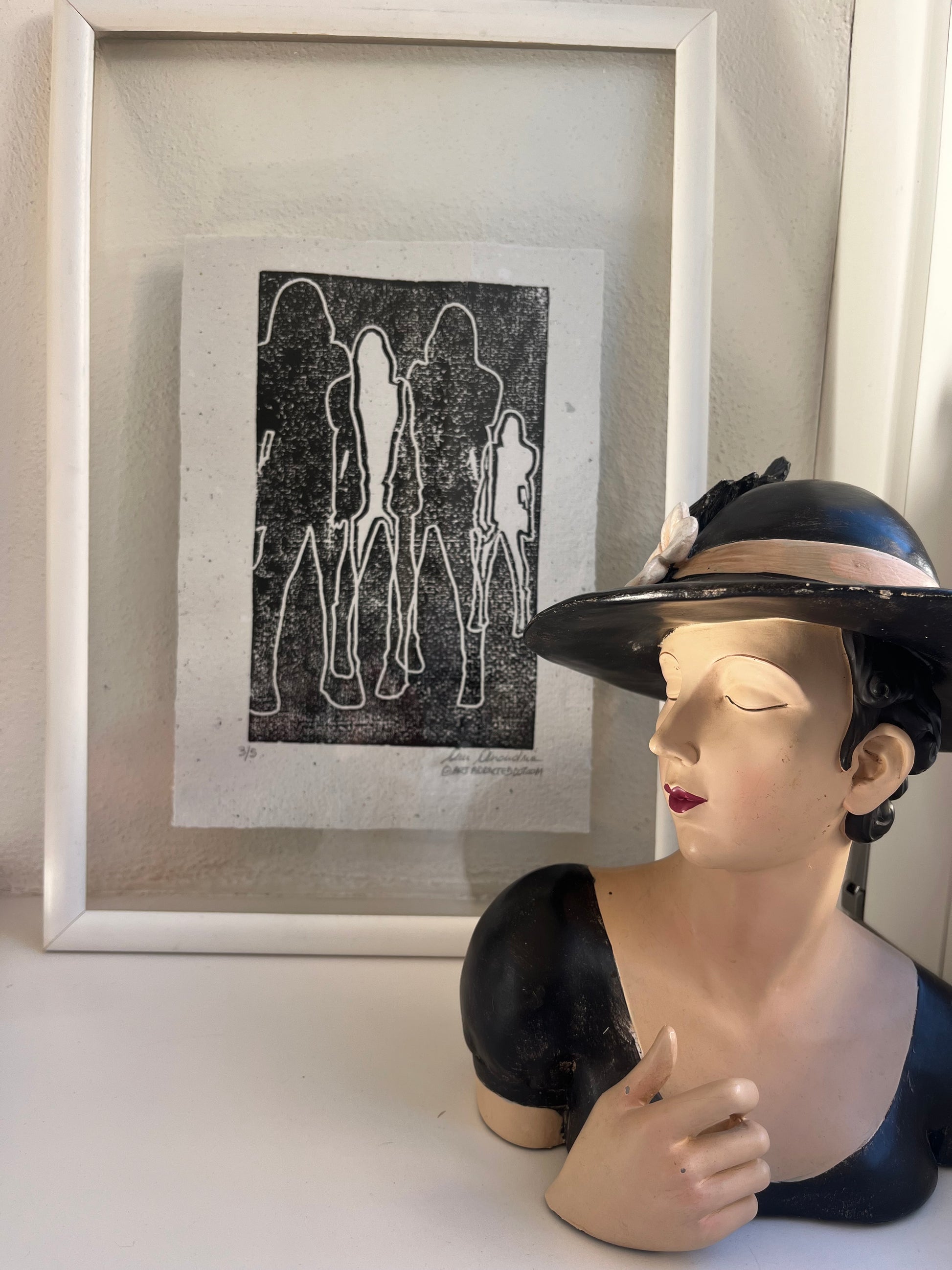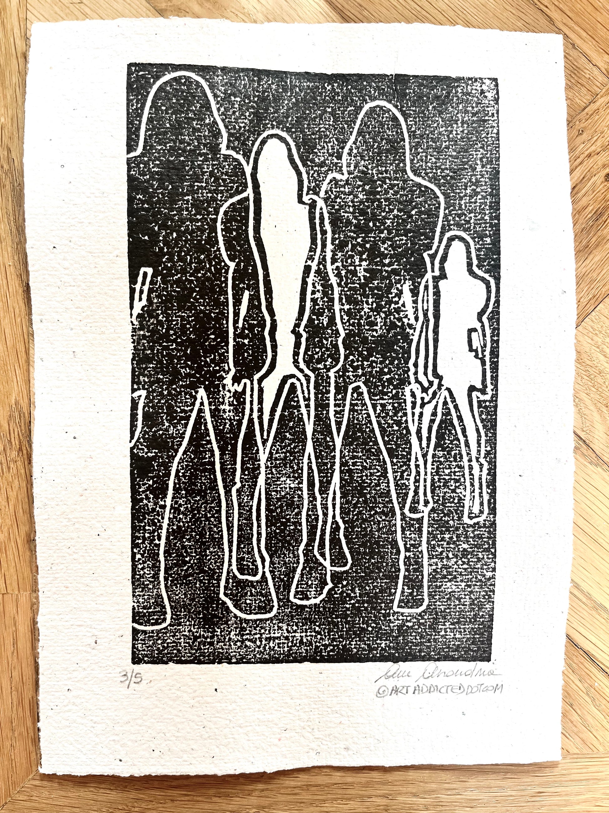 Elegant female silhouettes Linoleography ink on handmade paper.