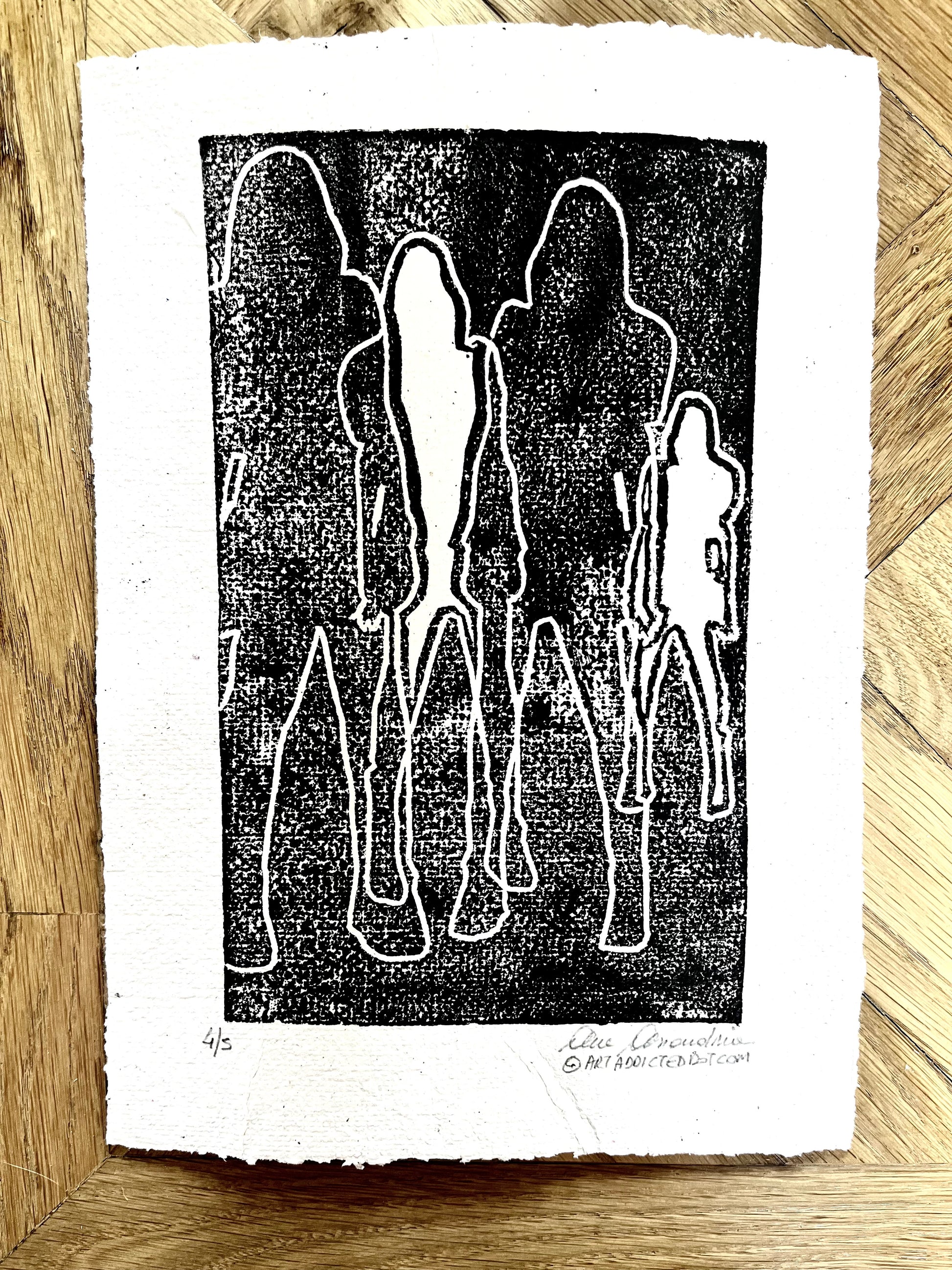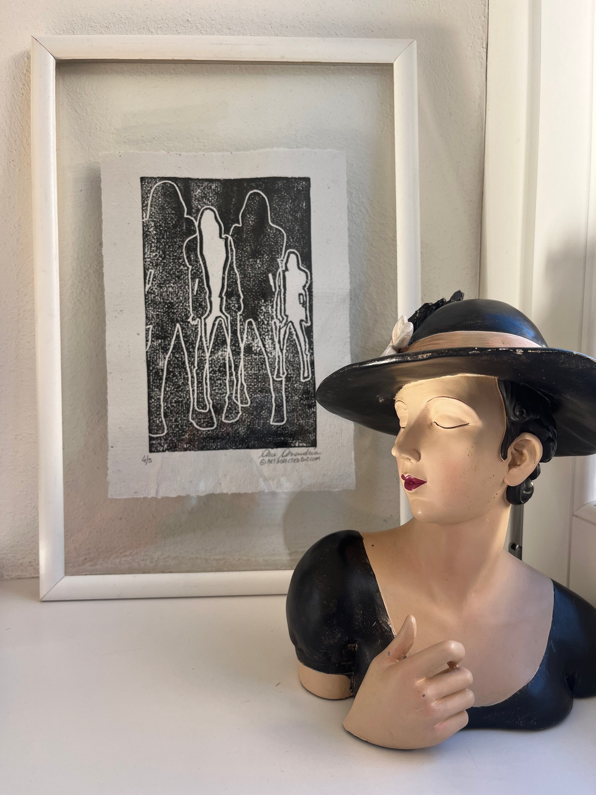 Elegant female silhouettes Linoleography ink on handmade paper.