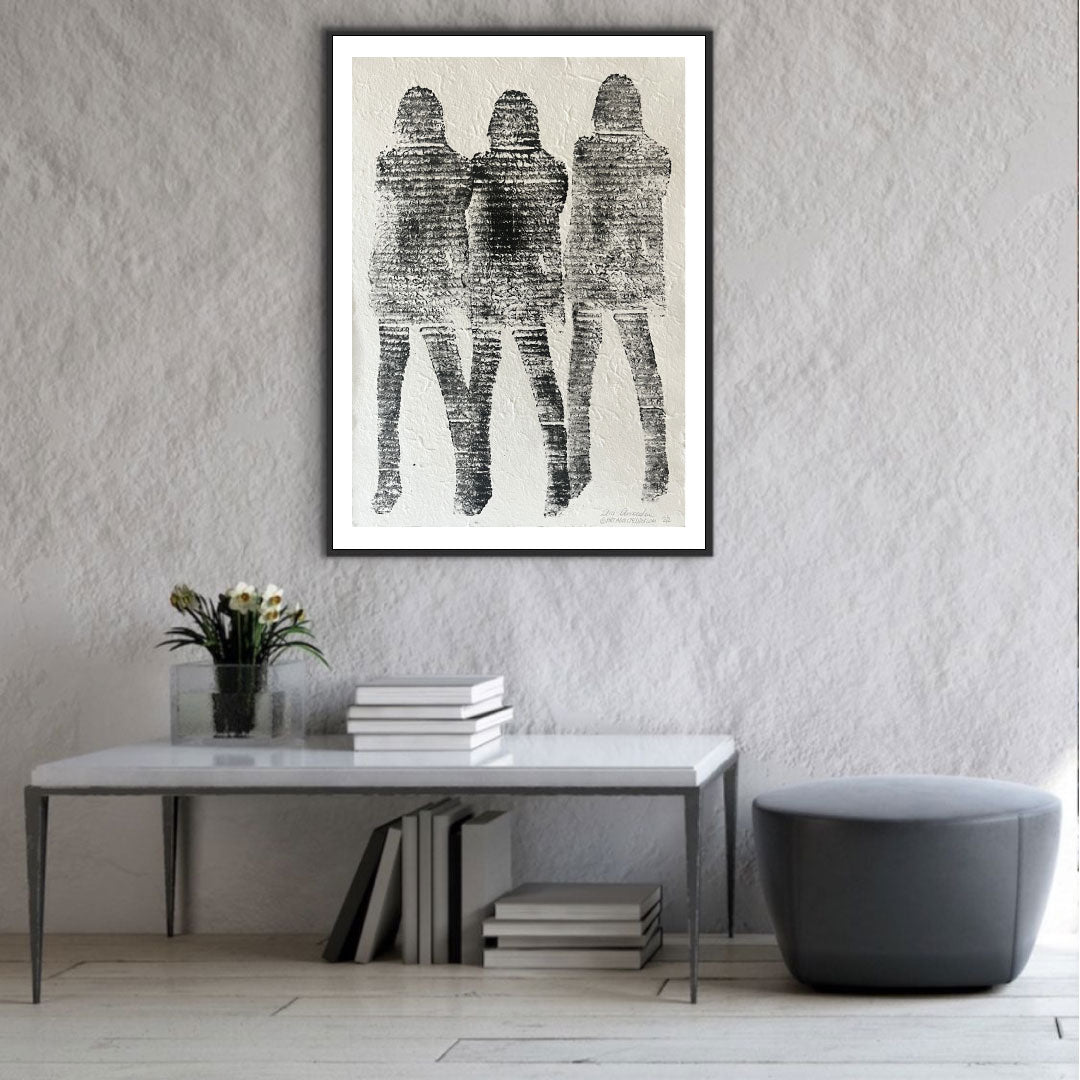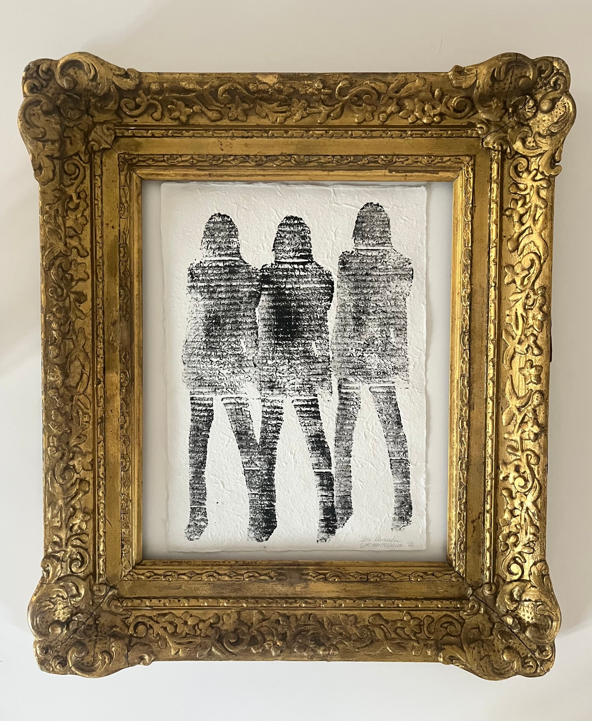Elegant female silhouettes Cardboard Monotype ink on handmade paper.