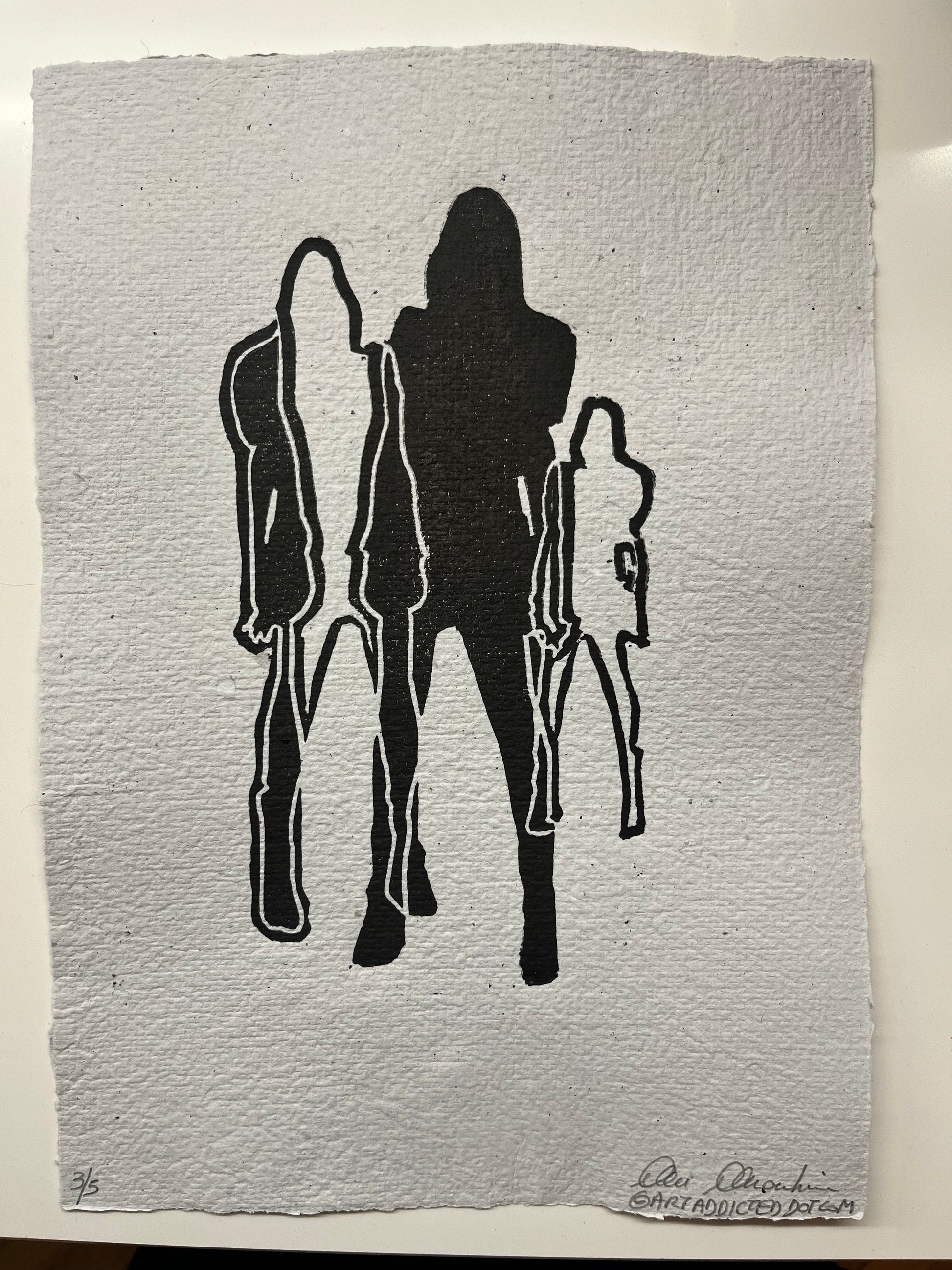 Elegant female silhouettes Linoleography ink on handmade paper.